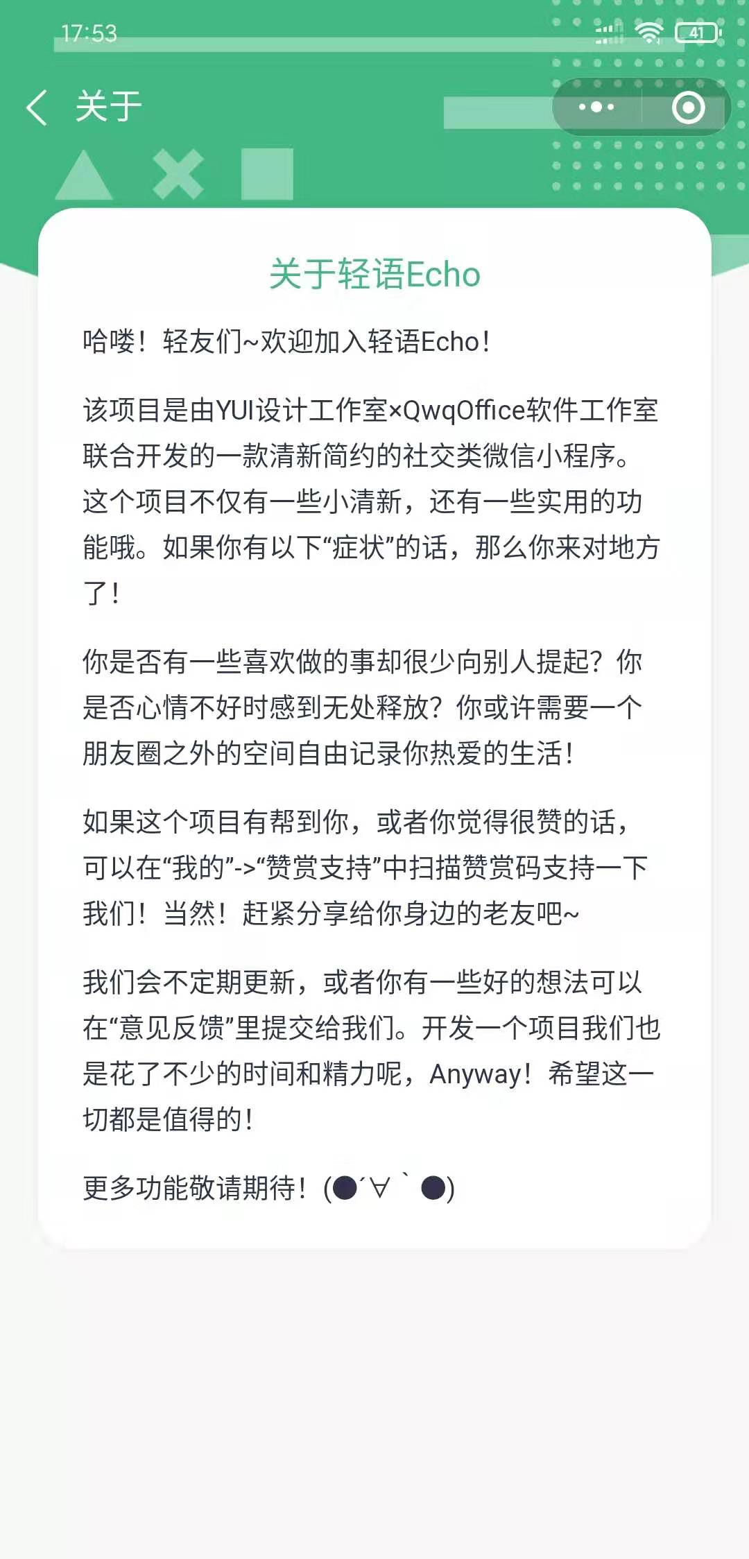 轻语Echo是一款由 YUI设计工作室 × QwqOffice软件工作室联合开发的清新简约风格以另一种“身份”自由记录日常生活的社交类微信小程序。